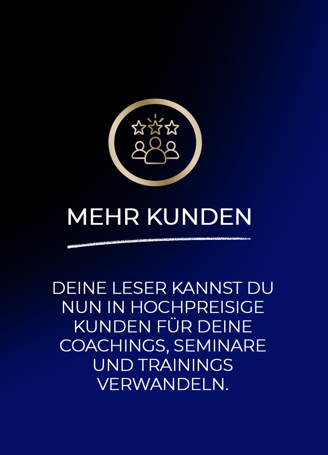 Mit deinem Buch erlangst du eine riesige Sichtbarkeit und Bekanntheit in deiner Zielgruppe, wodurch du einfach neue Interessenten und Kunden für deine Coachings, Seminare oder Beratungen gewinnen kannst.